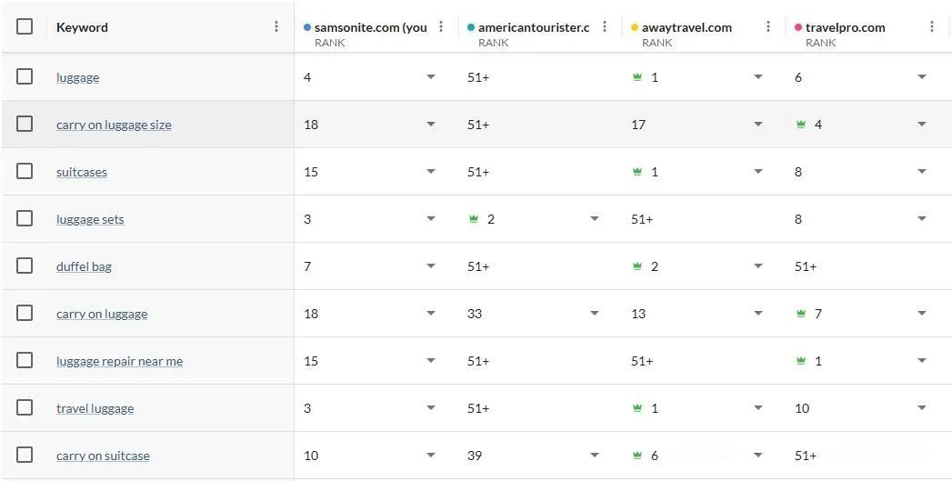 關鍵詞差距分析可能會讓人不知所措,火車時間顯示在出發板上,乘客前往 11 號站臺,但這是適合您業務的目的地嗎?現在你可以自信地回答這個問題,僅僅因為競爭對手對關鍵詞有排名并不意味著它與你的網站相關或有利可圖。默認情況下,Keyword Gap 2.0 專注于您已經排名但還有改進空間的關鍵字。請考慮 Samsonite 示例中的以下結果: